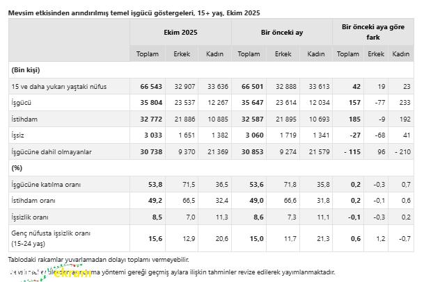 İşgücü, 2025 yılı Ekim ayında bir önceki aya göre 157 bin kişi artarak 35 milyon 804 bin kişi, işgücüne katılma oranı ise 0,2 puan artarak yüzde 53,8 olarak gerçekleşti.