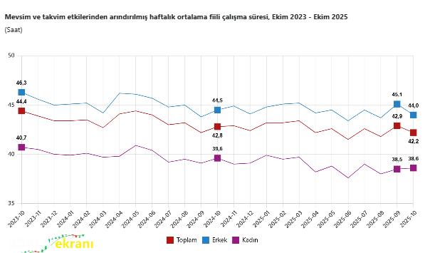 İstihdam edilenlerden referans döneminde işbaşında olanların, mevsim ve takvim etkilerinden arındırılmış haftalık ortalama fiili çalışma süresi 2025 yılı Ekim ayında bir önceki aya göre 0,7 saat azalarak 42,2 saat olarak gerçekleşti.
