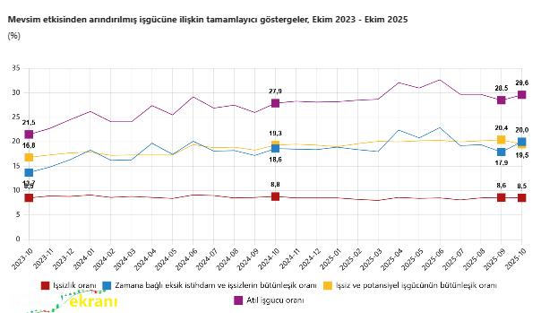Zamana bağlı eksik istihdam, potansiyel işgücü ve işsizlerden oluşan atıl işgücü oranı 2025 yılı Ekim ayında bir önceki aya göre 1,1 puan artarak yüzde 29,6 oldu.