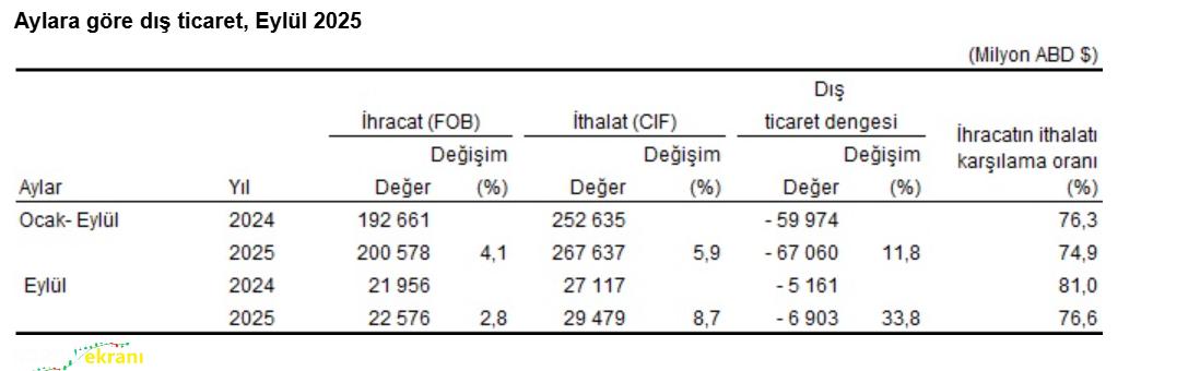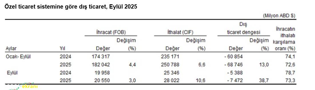 Özel ticaret sistemine göre ihracat, 2025 yılı Ocak-Eylül döneminde, bir önceki yılın aynı dönemine göre yüzde 4,4 artarak 182 milyar 42 milyon dolar, ithalat yüzde 6,6 artarak 250 milyar 788 milyon dolar olarak gerçekleşti. Ocak-Eylül döneminde dış ticaret açığı yüzde 13 artarak 60 milyar 854 milyon dolardan, 68 milyar 746 milyon dolara yükseldi. İhracatın ithalatı karşılama oranı 2024 Ocak-Eylül döneminde yüzde 74,1 iken, 2025 yılının aynı döneminde yüzde 72,6’ya geriledi.