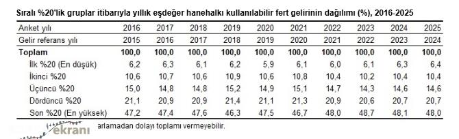 Türkiye İstatistik Kurumu’nun (TÜİK) Gelir Dağılımı İstatistikleri 2025 sonuçlarını açıkladı. Son yapılan araştırma sonuçlarına göre; en yüksek eşdeğer hanehalkı kullanılabilir fert gelirine sahip yüzde 20’lik grubun toplam gelirden aldığı pay bir önceki yıla göre 0,1 puan azalarak yüzde 48 oldu.nbsp;En düşük gelire sahip yüzde 20’lik grubun aldığı pay ise 0,1 puan artarak yüzde 6,4 olarak açıklandı. Gelir Dağılımı İstatistiklerinin hesaplandığı Gelir ve Yaşam Koşulları Araştırması 2025 yılı sonuçlarına ilişkin gelir bilgileri, bir önceki takvim yılı olan 2024 yılını referans alıyor. Gelir hesaplamalarında hanehalkı gelirleri; hanehalkı büyüklüğü ve kompozisyonu dikkate alınarak eşdeğer hanehalkı kullanılabilir fert gelirine dönüştürülüyor.