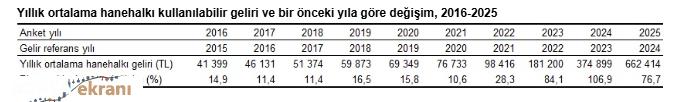 Türkiye’de yıllık ortalama hanehalkı kullanılabilir geliri bir önceki yıla göre yüzde 76,7 artarak 662 bin 414 TL oldu.