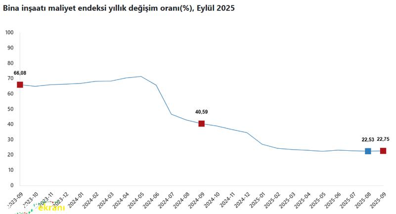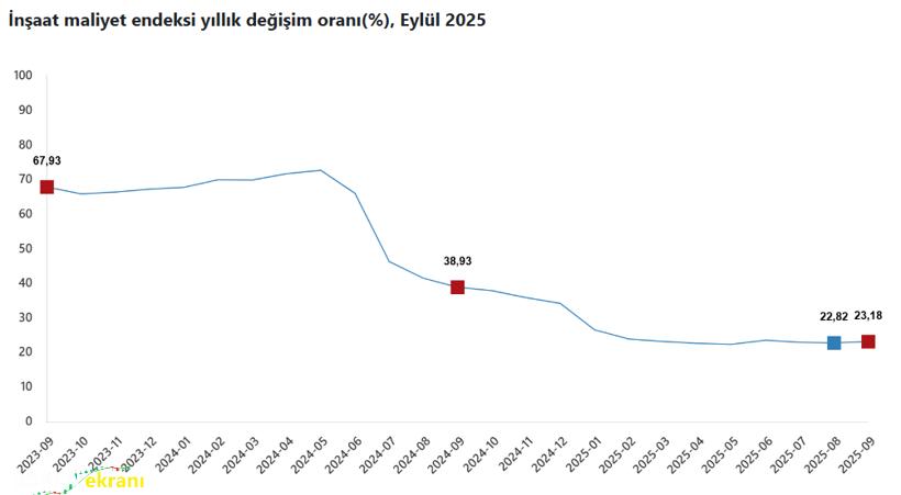 Türkiye İstatistik Kurumu (TÜİK) Eylül 2025’e ilişkin İnşaat Maliyet Endeksi verilerini yayımladı. Buna göre, inşaat maliyet endeksi, 2025 yılı Eylül ayında bir önceki aya göre yüzde 0,87 arttı, bir önceki yılın aynı ayına göre yüzde 23,18 arttı. Böylece eylülde maliyetlerde aylık bazda Aralık 2024’ten bu yana en düşük artış kaydedilirken yıllık bazdaki artış hızlandı. İnşaat maliyetleri ağustosta aylık yüzde 1,05, yıllık yüzde 22,82 artmıştı. Bir önceki aya göre malzeme endeksi yüzde 0,90 arttı, işçilik endeksi yüzde 0,82 arttı. Ayrıca bir önceki yılın aynı ayına göre malzeme endeksi yüzde 19,32 arttı, işçilik endeksi yüzde 30,99 arttı.