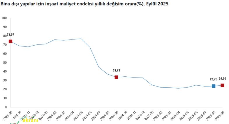 Bina dışı yapılar için inşaat maliyet endeksi, bir önceki aya göre yüzde 0,57 arttı, bir önceki yılın aynı ayına göre yüzde 24,60 arttı.