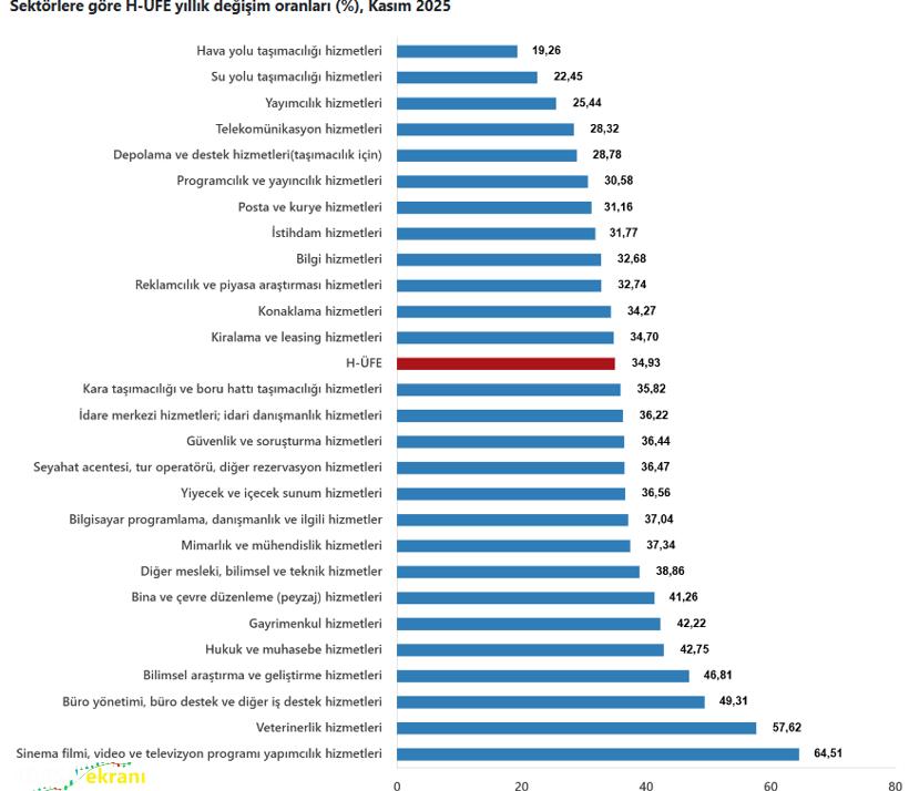 Yıllık bazda en yüksek artış gayrimenkul hizmetlerinde görüldü. Kasım ayında bir önceki yılın aynı ayına göre ulaştırma ve depolama hizmetlerinde yüzde 31,51, konaklama ve yiyecek hizmetlerinde yüzde 36,00, bilgi ve iletişim hizmetlerinde yüzde 35,19 artış yaşandı.