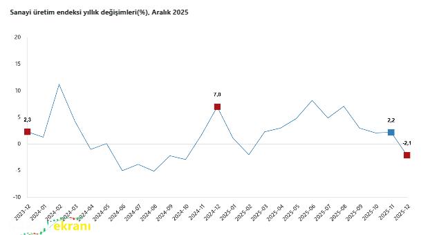 Türkiye İstatistik Kurumu (TÜİK), 2025 yılı Aralık ayına ait sanayi üretim endeksi verilerini açıkladı. Buna göre, sanayinin alt sektörleri (2021=100 referans yıllı) incelendiğinde, 2025 yılı Aralık ayında madencilik ve taş ocakçılığı sektörü endeksi bir önceki yılın aynı ayına göre yüzde 1,9, elektrik, gaz, buhar ve iklimlendirme üretimi ve dağıtımı sektörü endeksi yüzde 2,4 arttı.