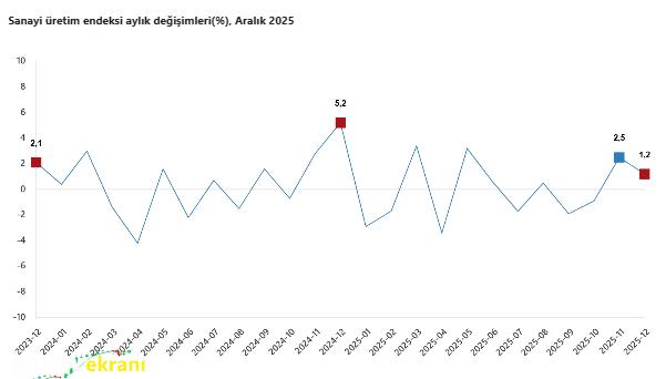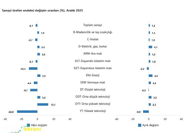 Sanayinin alt sektörleri incelendiğinde, 2025 yılı Aralık ayında madencilik ve taş ocakçılığı sektörü endeksi bir önceki aya göre yüzde 1,3, imalat sanayi sektörü endeksi yüzde 1 ve elektrik, gaz, buhar ve iklimlendirme üretimi ve dağıtımı sektörü endeksi yüzde 4,1 arttı.