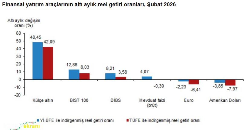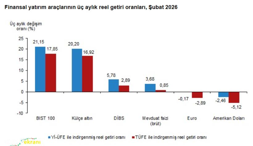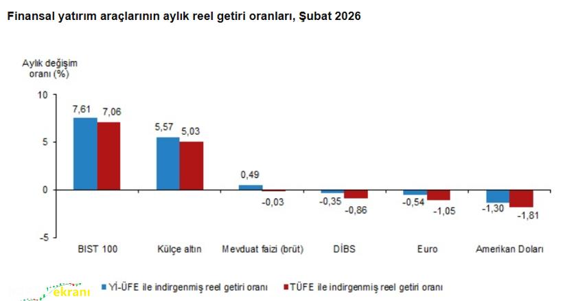 TÜİK verilerine göre Şubat ayında en yüksek reel getiri BIST 100 endeksinde gerçekleşti. Yurt içi üretici fiyat endeksi (Yİ-ÜFE) ile indirgendiğinde BIST 100 yatırımcısına yüzde 7,61, tüketici fiyat endeksi (TÜFE) ile indirgendiğinde ise yüzde 7,06 oranında reel kazanç sağladı. Aynı dönemde Yİ-ÜFE ile hesaplandığında külçe altın yüzde 5,57, mevduat faizi (brüt) yüzde 0,49 oranında yatırımcısına reel getiri sağladı. Buna karşılık Devlet İç Borçlanma Senetleri (DİBS) yüzde 0,35, Euro yüzde 0,54 ve Amerikan doları yüzde 1,30 oranında yatırımcısına kaybettirdi. TÜFE ile yapılan hesaplamaya göre ise külçe altın yüzde 5,03 oranında reel kazanç sağlarken; mevduat faizi yüzde 0,03, DİBS yüzde 0,86, Euro yüzde 1,05 ve Amerikan doları yüzde 1,81 oranında yatırımcısına kayıp yaşattı.
