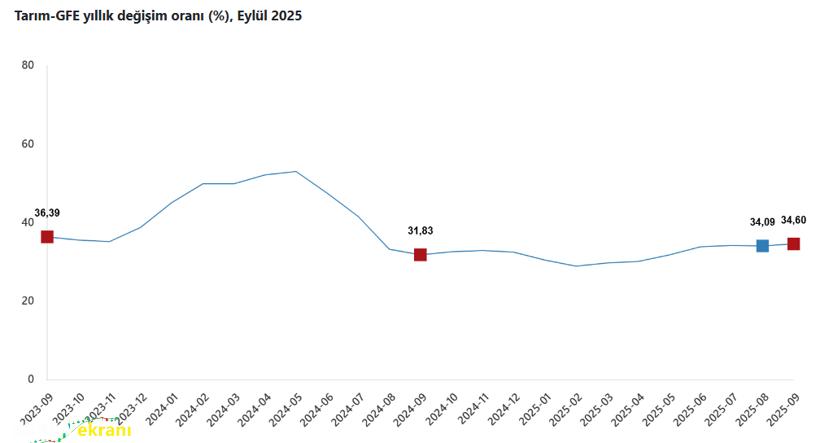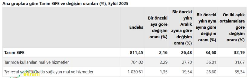 Türkiye İstatistik Kurumu (TÜİK), 2025 Eylül ayına ilişkin Tarımsal Girdi Fiyat Endeksi (Tarım-GFE) sonuçlarını açıkladı. Verilere göre tarımsal üretimde kullanılan girdilerin maliyet artışı Eylül ayında da devam etti. Endeks, bir önceki yılın aynı dönemine göre yüzde 34,60, aylık bazda ise yüzde 2,16 yükseldi. Rapora göre Tarım-GFE, Eylül ayında bir önceki aya kıyasla yüzde 2,16, Aralık 2024’e göre yüzde 26,48, on iki aylık ortalamalara göre ise yüzde 32,19 oranında artış gösterdi.