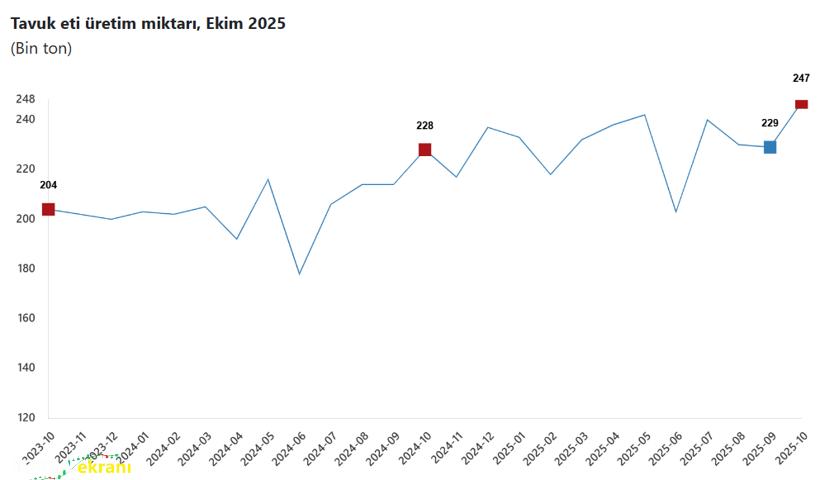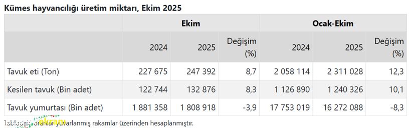 Ekim 2024’e göre tavuk yumurtası üretimi yüzde 3,9 azalırken, kesilen tavuk sayısı yüzde 8,3, tavuk eti üretimi ise yüzde 8,7 arttı.