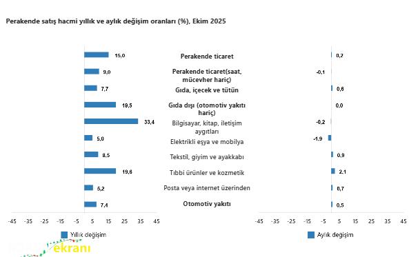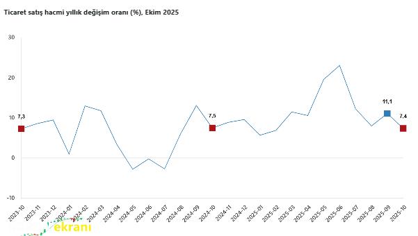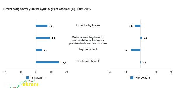 Türkiye İstatistik Kurumu (TÜİK), 2025 ekim ayına ait Ticaret Satış Hacim Endeksi’ni açıkladı. Buna göre, Ticaret satış hacmi (2021=100) 2025 yılı ekim ayında bir önceki yılın aynı ayına göre yüzde 7,4 arttı.nbsp;Aynı ayda motorlu kara taşıtlarının ve motosikletlerin toptan ve perakende ticareti ile onarımı için satış hacmi yüzde 9,1, toptan ticaret satış hacmi yüzde 3,8 ve perakende ticaret satış hacmi ise yüzde 15 arttı.