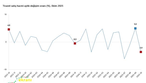 Ticaret satış hacmi (2021=100) 2025 yılı ekim ayında bir önceki aya göre yüzde 3,6 azaldı.