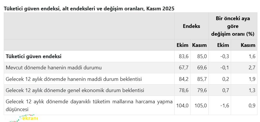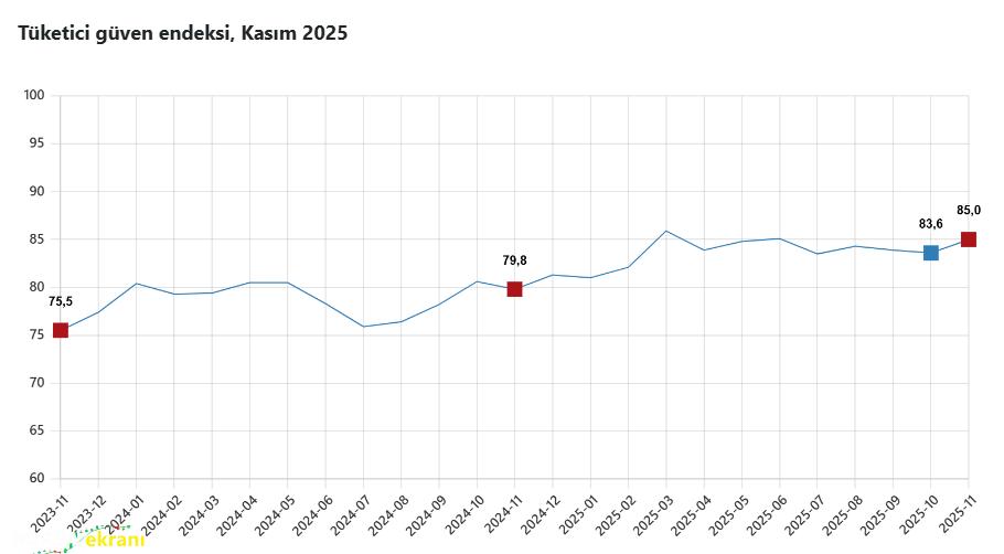 Türkiye İstatistik Kurumu ve Türkiye Cumhuriyet Merkez Bankası işbirliği ile yürütülen tüketici eğilim anketi sonuçlarından hesaplanan tüketici güven endeksi, Ekim ayında 83,6 iken Kasım ayında yüzde 1,6 oranında artarak 85 oldu. Tüketici güven endeksi 0-200 aralığında değer alabiliyor.