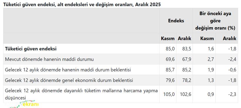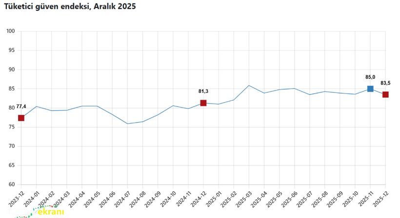 Türkiye İstatistik Kurumu (TÜİK) ile Türkiye Cumhuriyet Merkez Bankası (TCMB) işbirliğiyle yürütülen Tüketici Eğilim Anketi sonuçlarına göre, tüketici güven endeksi aralık ayında düşüş kaydetti. Kasım ayında 85,0 seviyesinde bulunan endeks, aralıkta bir önceki aya göre yüzde 1,8 azalarak 83,5 oldu. Tüketici güven endeksindeki gerileme, hanehalkının mevcut ekonomik duruma ve gelecek dönem beklentilerine ilişkin temkinli görünümünün sürdüğüne işaret ediyor. Endeksin 100’ün altında kalması, tüketici güveninin iyimserlik sınırının altında seyrettiğini gösterirken 100 üzerinde olması ise iyimserlik sınırının üzerinde olduğunu ifade ediyor.