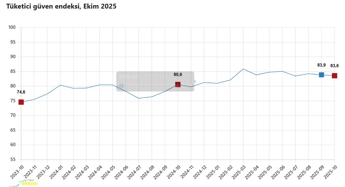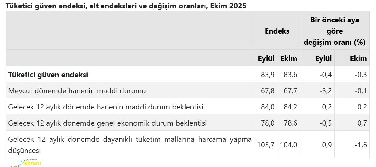 Türkiye İstatistik Kurumu ve Türkiye Cumhuriyet Merkez Bankası işbirliği ile yürütülen tüketici eğilim anketi sonuçlarından hesaplanan tüketici güven endeksi, Eylül ayında 83,9 iken Ekim ayında yüzde 0,3 oranında azalarak 83,6 olarak açıklandı. Tüketici güven endeksi 0-200 aralığında değer alabiliyor.