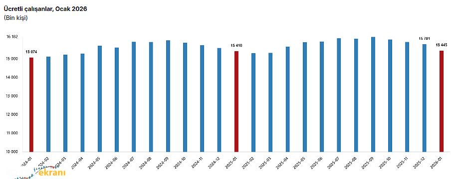 Türkiye İstatistik Kurumu (TÜİK), 2026 yılı Ocak ayına ait ücretli çalışan istatistiklerini açıkladı. Buna göre sanayi, inşaat ve ticaret-hizmet sektörleri toplamında ücretli çalışan sayısı 2026 Ocak ayında bir önceki yılın aynı ayına göre yüzde 0,2 arttı. Ücretli çalışan sayısı bir önceki yılın aynı ayında 15 milyon 410 bin 257 kişi iken, 2026 yılı Ocak ayında 15 milyon 444 bin 683 kişi oldu.