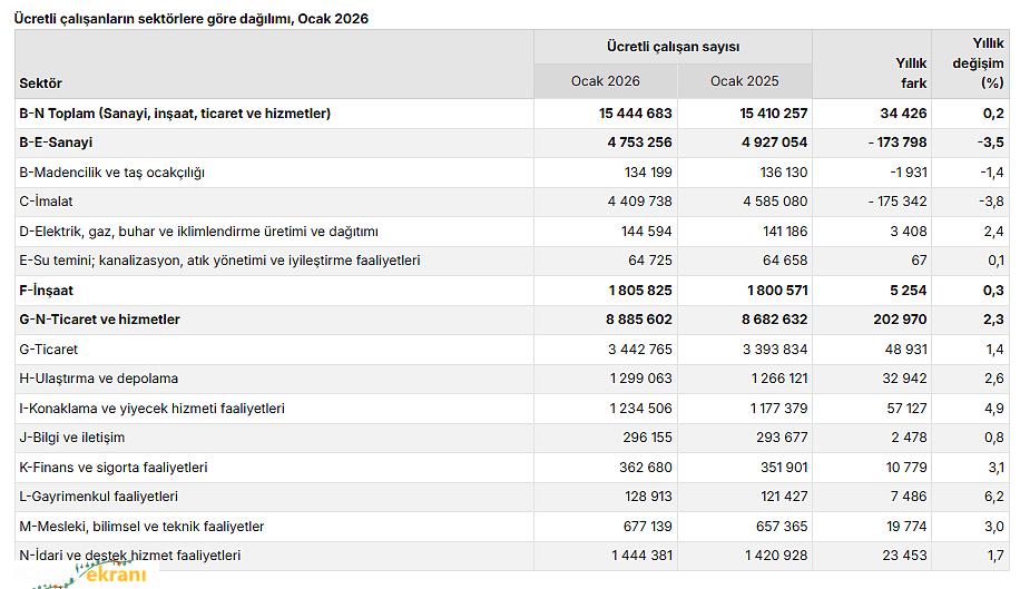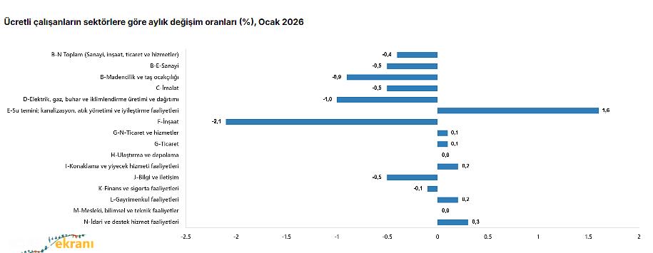 Ücretli çalışanların alt detaylarına bakıldığında 2026 Ocak ayında ücretli çalışanlar aylık olarak sanayi sektöründe yüzde 0,5, inşaat sektöründe yüzde 2,1 azaldı.nbsp;Ticaret-hizmet sektöründe ise yüzde 0,1 arttı.