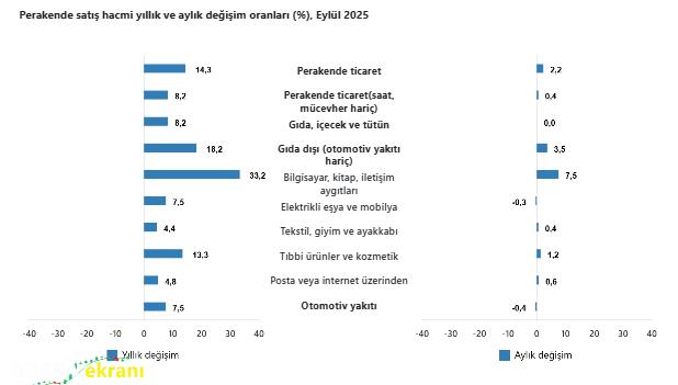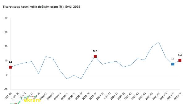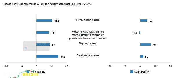 Türkiye İstatistik Kurumu (TÜİK), eylül ayına ilişkin Ticaret Satış Hacim Endeksi’ni açıkladı. Açıklanan verilere göre, ticaret satış hacmi (2021=100) 2025 yılı Eylül ayında bir önceki yılın aynı ayına göre yüzde 10,3 arttı.nbsp;Aynı ayda motorlu kara taşıtlarının ve motosikletlerin toptan ve perakende ticareti ile onarımı için satış hacmi yüzde 8,3, toptan ticaret satış hacmi yüzde 8,9 ve perakende ticaret satış hacmi ise yüzde 14,3 oranında arttı.