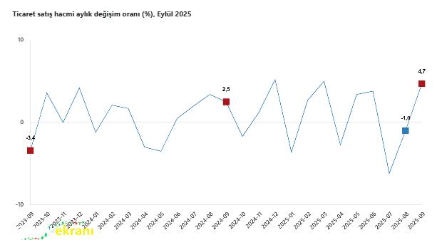 Ticaret satış hacmi (2021=100) 2025 yılı Eylül ayında bir önceki aya göre yüzde 4,7 arttı.