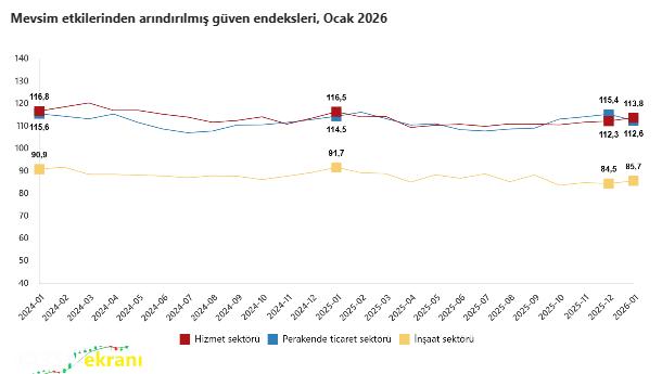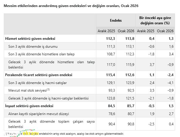 Türkiye İstatistik Kurumu (TÜİK), 2026 yılı Ocak ayına ilişkin Hizmet, Perakende Ticaret ve İnşaat Güven Endeksleri’ni yayımladı.nbsp;Buna göre, mevsim etkilerinden arındırılmış güven endeksi ocak ayında bir önceki aya göre; hizmet sektöründe yüzde 1,3 oranında artarak 113,8 değerini, perakende ticaret sektöründe yüzde 2,4 oranında azalarak 112,6 değerini aldı. İnşaat sektöründe ise yüzde 1,5 oranında artarak 85,7 değerine ulaştı. Hizmet sektöründe, ocakta bir önceki aya oranla son 3 aylık dönemde iş durumu yüzde 1,6, son 3 aylık dönemde hizmetlere olan talep yüzde 3,4 artarken, gelecek 3 aylık dönemde hizmetlere olan talep beklentisi yüzde 0,9 azaldı. Perakende ticaret sektöründe, son 3 aylık dönemde iş hacmi-satışlar yüzde 4,1, mevcut mal stok seviyesi yüzde 0,9, gelecek 3 aylık dönemde iş hacmi-satışlar beklentisi yüzde 1,8 azalış kaydetti.