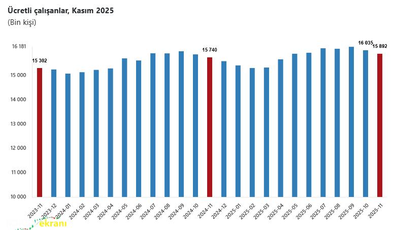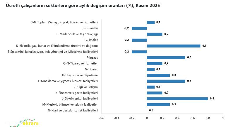 Ücretli çalışanların alt detaylarına bakıldığında ise 2025 Kasım ayında ücretli çalışanlar aylık olarak sanayi sektöründe yüzde 0,2 azalırken, inşaat sektöründe yüzde 0,5 ve ticaret-hizmet sektöründe yüzde 0,2 arttı.