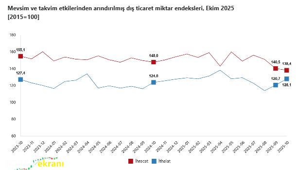 Takvim etkilerinden arındırılmış seriye göre ise ihracat miktar endeksi; 2024 yılı ekimde 153,9 iken 2025 yılı ekim ayında yüzde 7 oranında azalarak 143,1 oldu.
