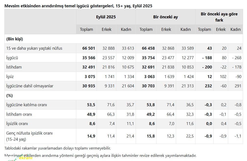 Eylül ayında Türkiye’de işsizlik oranı, bir önceki aya göre sabit kalarak yüzde 8,6 olarak gerçekleşti. İşsizlik oranı erkeklerde yüzde 7,4, kadınlarda ise yüzde 11,1 düzeyinde tahmin edildi. Eylül ayı işsizlik oranı bir ay öncesine göre %8,6 olarak aynı kaldı. Geniş İşsizlik tanımlarından atıl iş gücü oranı ise 1,2 puan azalarak %28,6 oldu. Genç nüfustaki işsizlik oranı 0,9 puan azalarak 14,9 oldu.