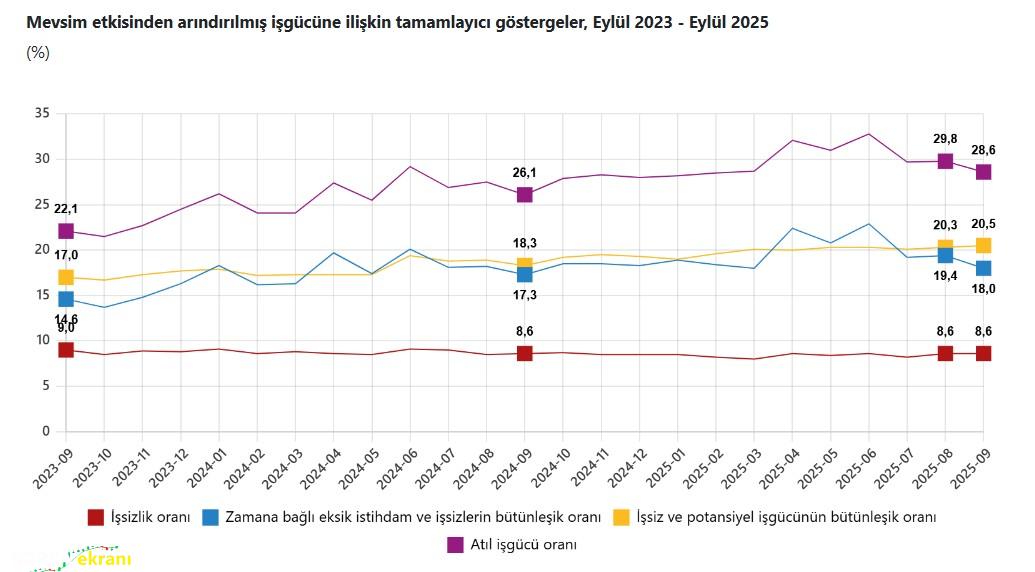 Zamana bağlı eksik istihdam, potansiyel işgücü ve işsizlerden oluşan atıl işgücü oranı 2025 yılı Eylül ayında bir önceki aya göre 1,2 puan azalarak %28,6 oldu.