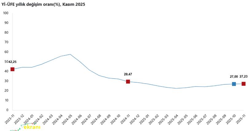 Türkiye İstatistik Kurumu (TÜİK) Kasım 2025’e ilişkin Yurt İçi Üretici Fiyat Endeksi verilerini yayımladı. Buna göre, Yİ-ÜFE (2003=100) 2025 yılı Kasım ayında bir önceki aya göre yüzde 0,84 artış, bir önceki yılın Aralık ayına göre yüzde 26,72 artış, bir önceki yılın aynı ayına göre yüzde 27,23 artış ve on iki aylık ortalamalara göre yüzde 25,37 artış gösterdi.