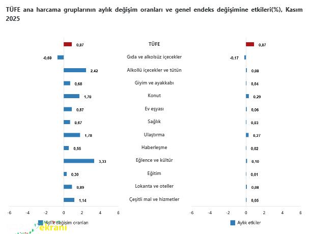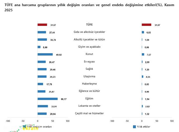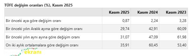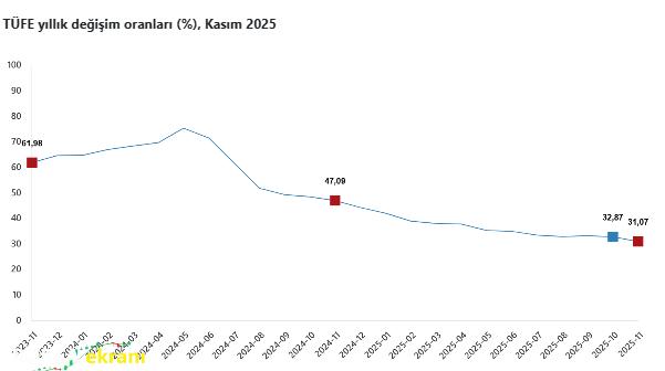 Türkiye İstatistik Kurumu (TÜİK), 2025 yılı kasım ayı enflasyon rakamlarını açıkladı. Açıklanan rakamlara göre, TÜFE’deki (2003=100) değişim 2025 yılı Kasım ayında bir önceki aya göre yüzde 0,87, bir önceki yılın Aralık ayına göre yüzde 29,74, bir önceki yılın aynı ayına göre yüzde 31,07 ve on iki aylık ortalamalara göre yüzde 35,91 arttı. Tüketici Fiyat Endeksi, ekimde yüzde 2,55 artmıştı.