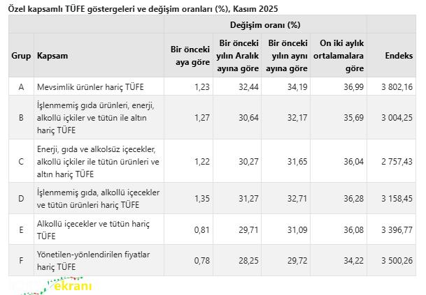 İşlenmemiş gıda ürünleri, enerji, alkollü içkiler ve tütün ile altın hariç TÜFE’deki değişim, 2025 yılı Kasım ayında bir önceki aya göre %1,27 artış, bir önceki yılın Aralık ayına göre %30,64 artış, bir önceki yılın aynı ayına göre %32,17 artış ve on iki aylık ortalamalara göre %35,69 artış olarak gerçekleşti.