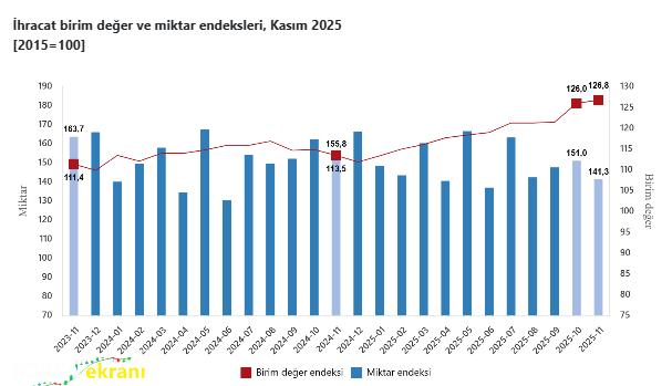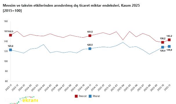 Mevsim ve takvim etkilerinden arındırılmış seriye göre ihracat miktar endeksi; 2025 Ekim ayında 138,2 iken 2025 Kasım ayında yüzde 3,6 oranında artarak 143,2 oldu.nbsp;Takvim etkilerinden arındırılmış seriye göre ise ihracat miktar endeksi; 2024 yılı Kasım ayında 155,4 iken 2025 yılı Kasım ayında yüzde 5,6 oranında azalarak 146,7 oldu.