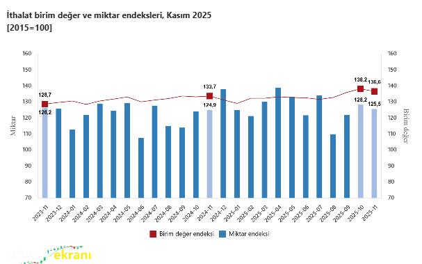 Mevsim ve takvim etkilerinden arındırılmış ithalat miktar endeksinde yüzde 1,2’lik artışMevsim ve takvim etkilerinden arındırılmış seriye göre ithalat miktar endeksi; 2025 Ekim ayında 128,4 iken 2025 Kasım ayında yüzde 1,2 oranında artarak 129,9 oldu.nbsp;Takvim etkilerinden arındırılmış seriye göre ise ithalat miktar endeksi; 2024 yılı Kasım ayında 124,7 iken 2025 yılı Kasım ayında yüzde 3,5 oranında artarak 129,1 oldu.