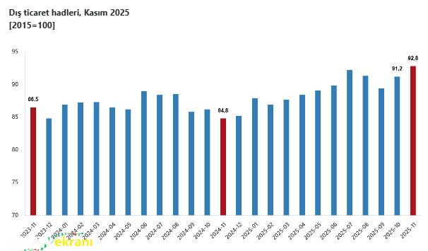 Dış ticaret haddi 2025 yılı Kasım ayında 92,8 olarak gerçekleştiİhracat birim değer endeksinin ithalat birim değer endeksine bölünmesiyle hesaplanan ve 2024 yılı Kasım ayında 84,8 olarak elde edilmiş olan dış ticaret haddi, 8,0 puan artarak, 2025 yılı Kasım ayında 92,8 oldu.