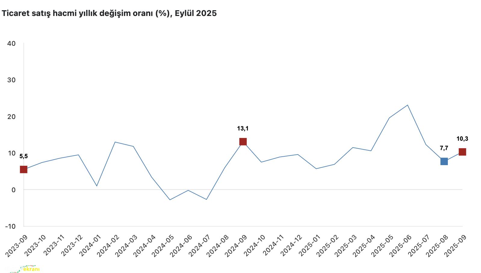 TÜİK’in açıkladığı ticaret satış hacmi endeksine göre, 2025 yılı Eylül ayında toplam ticaret satış hacmi geçen yılın aynı dönemine göre %10,3 oranında artış gösterdi. Alt kalemler incelendiğinde, motorlu kara taşıtları ve motosikletlerin satış ve onarımı alanında yıllık bazda %8,3, toptan ticarette %8,9 ve perakende ticarette %14,3 oranında artış kaydedildi. Aylık bazdaki verilere bakıldığında ise toplam ticaret satış hacmi bir önceki aya göre %4,7 oranında yükseldi. Bu dönemde motorlu taşıtlar grubunda %0,4’lük hafif bir gerileme yaşanırken, toptan ticaret hacmi %7,0, perakende ticaret hacmi ise %2,2 oranında arttı. Bu durum, iç talepte canlılığın sürdüğüne işaret etti.