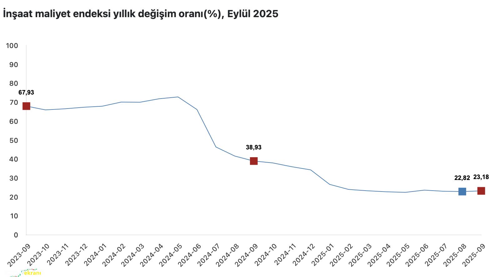 Eylül ayı inşaat maliyet verilerine göre, inşaat maliyet endeksi bir önceki aya göre %0,87, bir önceki yılın aynı ayına göre ise %23,18 artış kaydetti. Aylık bazda malzeme endeksinde %0,90 ve işçilik endeksinde %0,82 oranında fiyat artışları görüldü. Yıllık bazda ise malzeme fiyatları %19,32, işçilik maliyetleri %30,99 oranında yükseldi. Bina inşaatı maliyet endeksi de Eylül ayında aylık bazda %0,96, yıllık bazda ise %22,75 oranında arttı. Bu artışta malzeme fiyatlarının aylık %1,06 ve yıllık %18,82 oranındaki yükselişi önemli rol oynarken, işçilik maliyetleri de aylık %0,80 ve yıllık %30,47 oranında artış gösterdi.