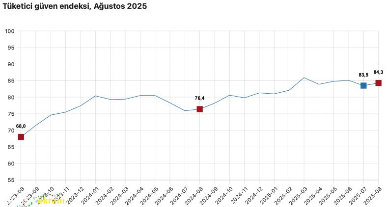 Türkiye İstatistik Kurumu ve Türkiye Cumhuriyet Merkez Bankası işbirliği ile yürütülen tüketici eğilim anketi sonuçlarından hesaplanan tüketici güven endeksi, Temmuz ayında 83,5 iken Ağustos ayında yüzde 0,9 oranında artarak 84,3 oldu. h
