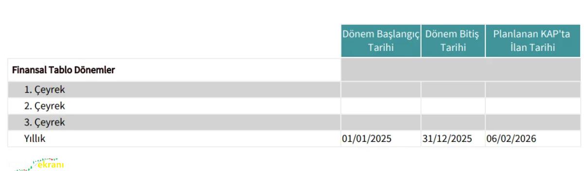 Şirketimizin 01.01.2025 – 31.12.2025 hesap dönemine ilişkin finansal raporlarının 06 Şubat 2026 tarihinde kamuya açıklanması planlanmaktadır. Kurumsal politikalarımız gereği, finansal tabloların açıklanmasından önceki iki hafta süresince “sessiz dönem” uygulaması yürütülecek olup, bu dönemde kamuya açıklanmış bilgiler hariç, Şirket’in finansal durumu hakkında herhangi bir bilgi verilemez. Bu kapsamda, analistler, yatırımcılar ve diğer sermaye piyasası katılımcılarının finansal durum ile ilgili toplantı talepleri kabul edilmez ve bu konulardaki soruları cevaplanmaz.