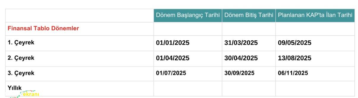 Şirketin KAP’a gönderdiği açıklama şu şekildedir:Şirketimizin 1 Temmuz 2025-30 Eylül 2025 dönemine ilişkin finansal sonuçlarının 6 Kasım 2025 tarihinde, Borsa İstanbul seans kapanışı sonrasında kamuya açıklanması planlanmaktadır.