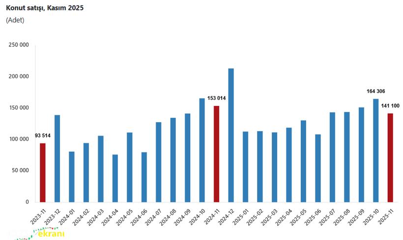 Türkiye İstatistik Kurumu (TÜİK), Kasım ayına ilişkin konut satış istatistiklerini yayımladı. Buna göre Türkiye genelinde konut satışları, Kasım ayında geçen yılın aynı ayına göre yüzde 7,8 azalarak 141 bin 100 oldu. Kasım ayında en fazla konut satışı 24 bin 234 ile İstanbul’da gerçekleşti. İstanbul’u 12 bin 706 satışla Ankara, 8 bin 540 satışla İzmir izledi. En az konut satışı yapılan iller ise 78 ile Ardahan, 131 ile Bayburt ve 152 ile Artvin oldu.