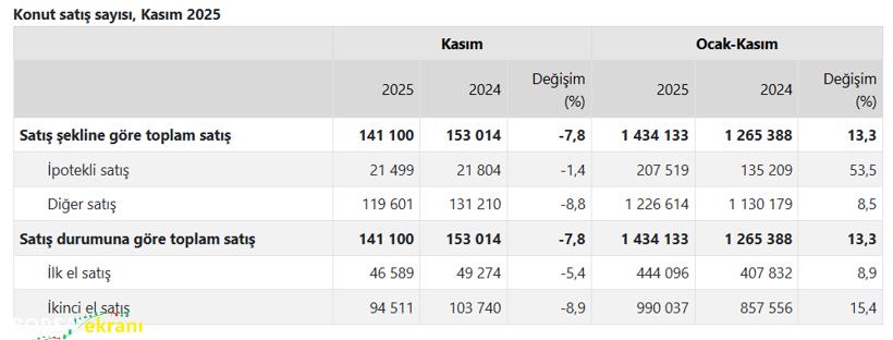 Bu satışların toplam konut satışları içindeki payı yüzde 84,8 olarak kaydedildi. Ocak-Kasım döneminde diğer satış türleriyle yapılan konut satışları yüzde 8,5 artarak 1 milyon 226 bin 614 oldu.