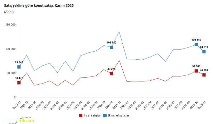 Kasım ayında ilk el konut satışları yüzde 5,4 azalarak 46 bin 589’a geriledi. İlk el satışların toplam satışlar içindeki payı yüzde 33 oldu.