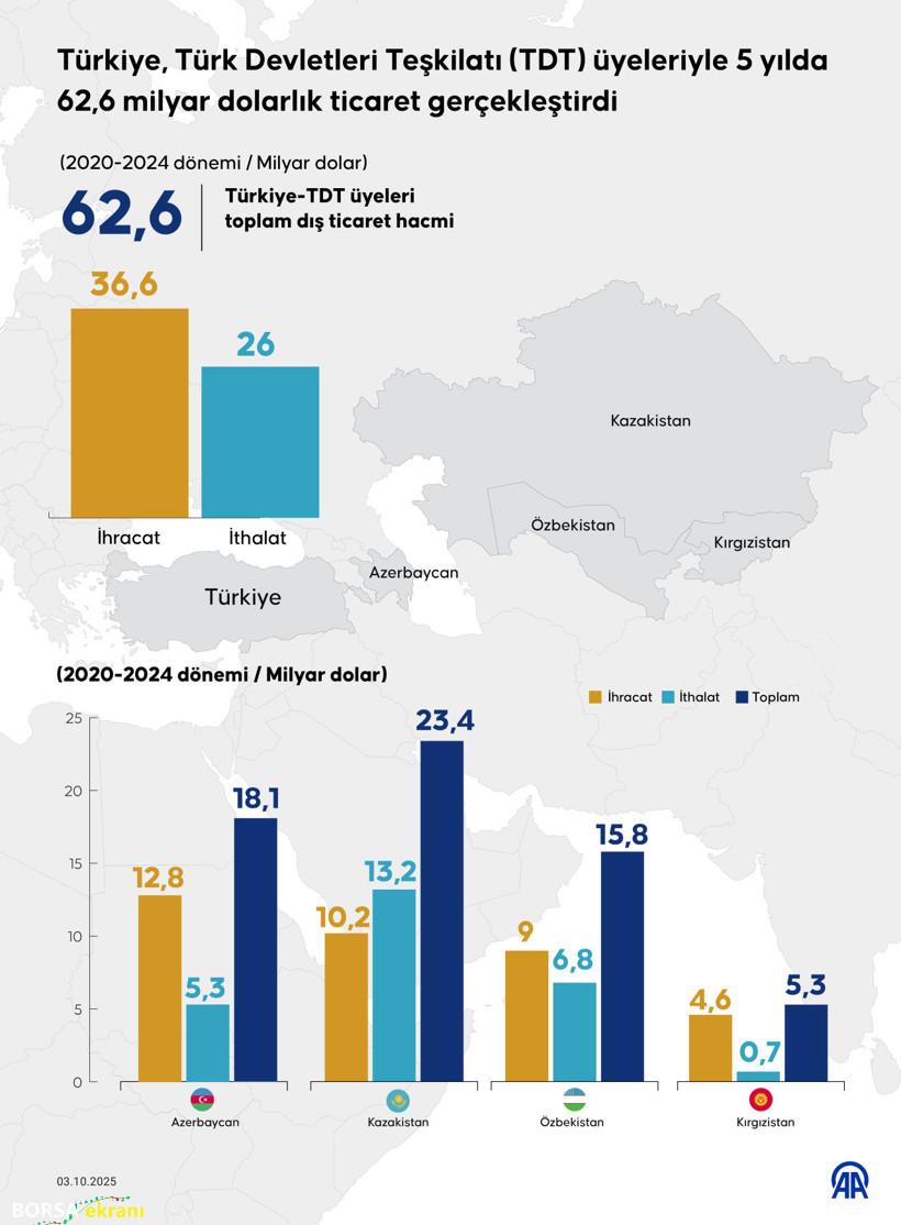 Türkiye’nin teşkilata üye ülkelerle stratejik ticaret ortaklığı bulunurken, bu ülkelerle karşılıklı ticareti son yıllarda ivme kazandı. Türkiye İstatistik Kurumu (TÜİK) Genel Ticaret Sistemi verilerine göre, 2020-2024 döneminde Azerbaycan, Kazakistan, Kırgızistan ve Özbekistan’a toplam ihracat 36,6 milyar dolar oldu. Aynı dönemde, söz konusu ülkelerden toplam ithalat da yaklaşık 26 milyar dolar olarak kayıtlara geçti. Böylelikle Türkiye’nin TDT üyesi bu ülkelerle son 5 yıldaki ticaret hacmi 62,6 milyar dolara ulaştı.
