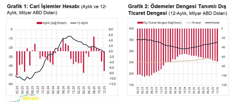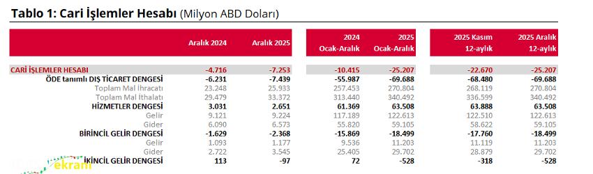 Türkiye Cumhuriyet Merkez Bankası (TCMB), 2025 yılı Aralık ayına ilişkin Ödemeler Dengesi İstatistikleri’ni açıkladı. Buna göre, Aralık ayında cari işlemler hesabı 7.253 milyon ABD doları açık verdi.nbsp;Altın ve enerji hariç cari işlemler hesabı ise 691 milyon ABD doları açık vermiştir. Ödemeler dengesi tanımlı dış ticaret açığı 7.439 milyon ABD doları olarak gerçekleşti.