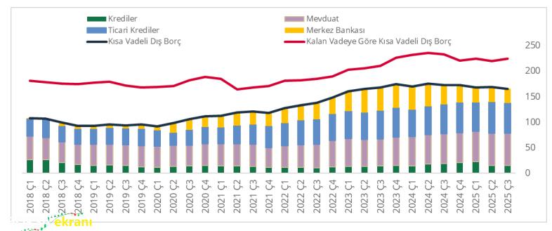 Türkiye’nin Kısa Vadeli Dış Borç (KVDB) stoku, eylül ayında 165,8 milyar dolar olurken orijinal vadesine bakılmaksızın vadesine 1 yıl veya daha az kalmış borçları gösteren kalan vadeye göre KVDB stoku ise 224,8 milyar dolar olarak gerçekleşti.