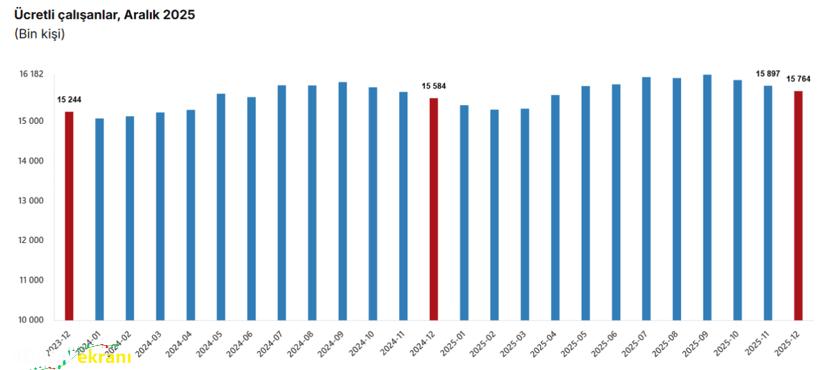 Bir önceki yılın aynı ayında 15 milyon 583 bin 773 kişi olan toplam ücretli çalışan sayısında yaklaşık 180 bin kişilik artış kaydedildi.