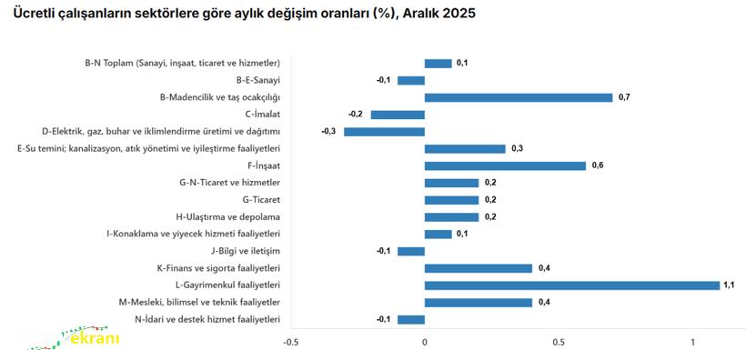 Alt sektörler incelendiğinde tablo farklılık gösterdi. Aralık 2025’te yıllık bazda, sanayi sektöründe ücretli çalışan sayısı yüzde 3,6 azaldı. İnşaat sektöründe yüzde 7,0 artış görülürken ticaret-hizmet sektöründe ise yüzde 2,6 artış kaydedildi.