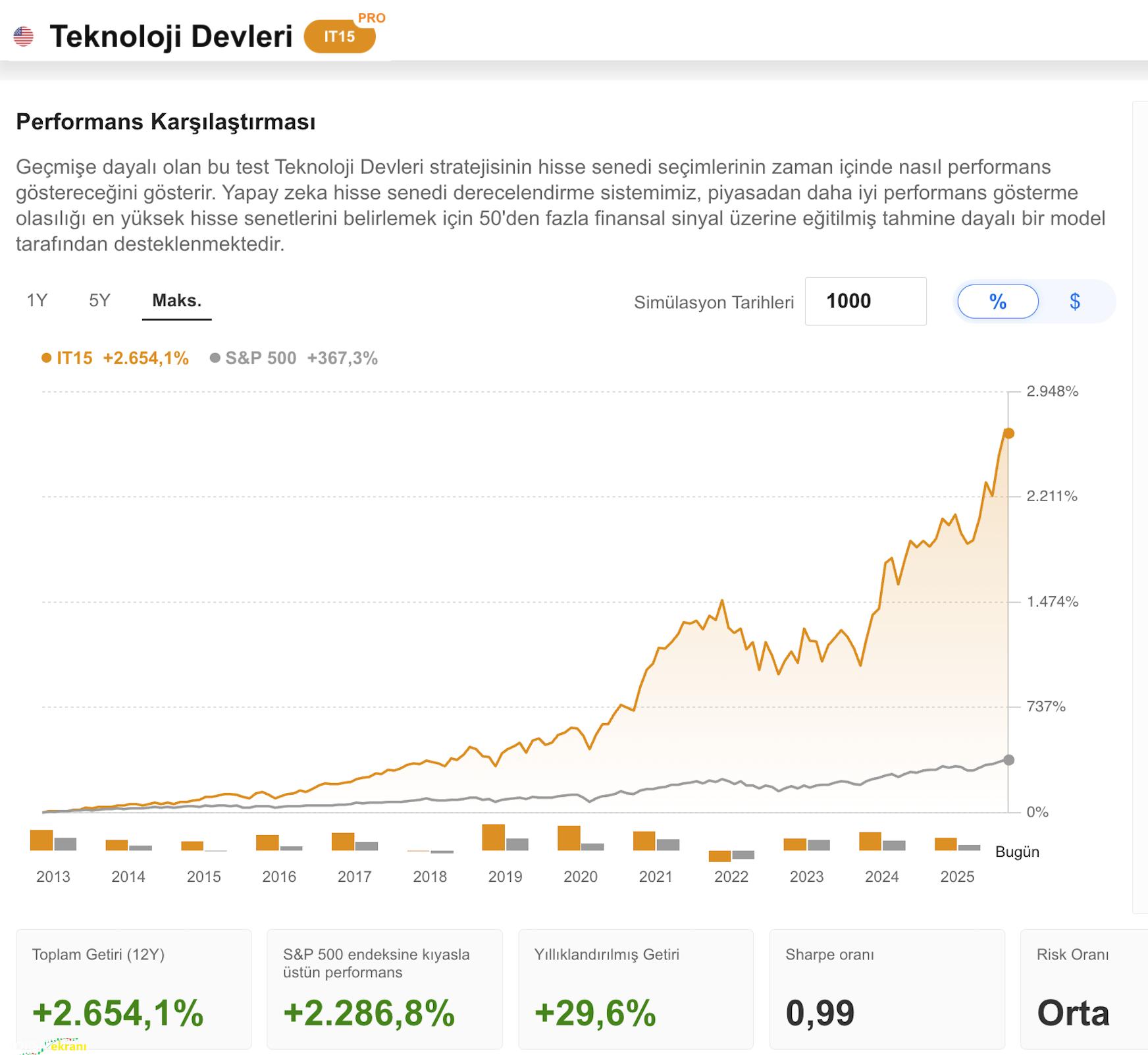 Ünlü teknoloji hisseleri kısa vadede temel göstergelerde zirveye yaklaşırken, Wall Street bu grubun güçlü kâr artışına ancak 2026’nın ilk çeyreğinde yeniden ulaşacağını öngörüyor. Bu nedenle, güçlü temellere sahip ancak radar altında kalan şirketleri bulmak, dördüncü çeyrek portföy başarısında kritik bir rol oynayabilir. İşte tam bu noktada yatırımcı düzeyinde geliştirilen yapay zekâ destekli model fark yaratıyor. Model, Wall Street’in en çok kullanılan yüzlerce finansal analiz metodunu tek tek her hisseye uyguluyor. Ardından bu analizleri kontrol gruplarıyla karşılaştırarak, rastgele seçilmiş hisselere ve temel endekslere göre istatistiksel olarak avantajlı olanları belirliyor. Bu sonuçlar doğrultusunda yapay zekâ, her ayın başında stratejileri yeniliyor ve en fazla 20 hisseyi yeniden seçiyor. Bu seçimler, 15 yılı aşkın küresel finansal veri üzerinden derlenen 150’den fazla finansal modelin harmanlanmasıyla oluşturuluyor. Bazı hisseler ekleniyor, bazıları korunuyor, bazıları ise çıkarılıyor. Böylece model, her şirketin orta vadeli büyüme potansiyelini sürekli olarak yeniden değerlendiriyor. Sonuçta hisse seçimi hâlâ olasılıklarla ilerleyen bir süreç. Ancak önemli olan yalnızca doğru şirketleri bulmak değil, potansiyelini kaybedenlerden zamanında uzaklaşabilmek. Model, lansmanından bu yana bunu istikrarlı biçimde yapıyor ve süreç boyunca birçok öne çıkan başarı hikayesine imza attı. Geriye dönük veriler ise açık konuşuyor: uzun vadede sabırlı kalmak, servet yaratmanın en güçlü yolu olmaya devam ediyor. Aşağıda, Teknoloji Devleri stratejisinin S&P 500’e karşı son 12 yıldaki üstün performansını görebilirsiniz. Bu, stratejimizde 100 bin dolarlık bir anaparanın 2.420.100 dolar gibi göz kamaştırıcı bir rakama dönüştüğü anlamına geliyor.