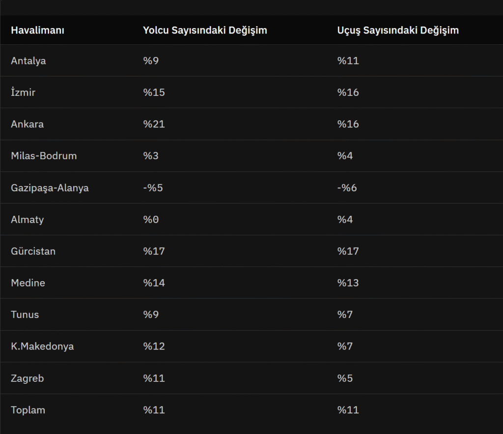 Havalimanı bazında yolcu sayısı değişim oranları ise şöyle: Antalya %9, İzmir %15, Ankara %21, Milas-Bodrum %3, Gazipaşa-Alanya -%5, Almaty %0, Gürcistan %17, Medine %14, Tunus %9, Kuzey Makedonya %12, Zagreb %11. Uçuş sayısındaki değişim sırasıyla %11, %16, %16, %4, -%6, %4, %17, %13, %7, %7, %5.