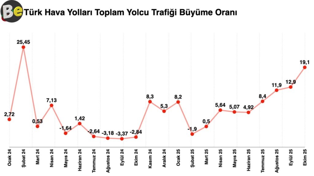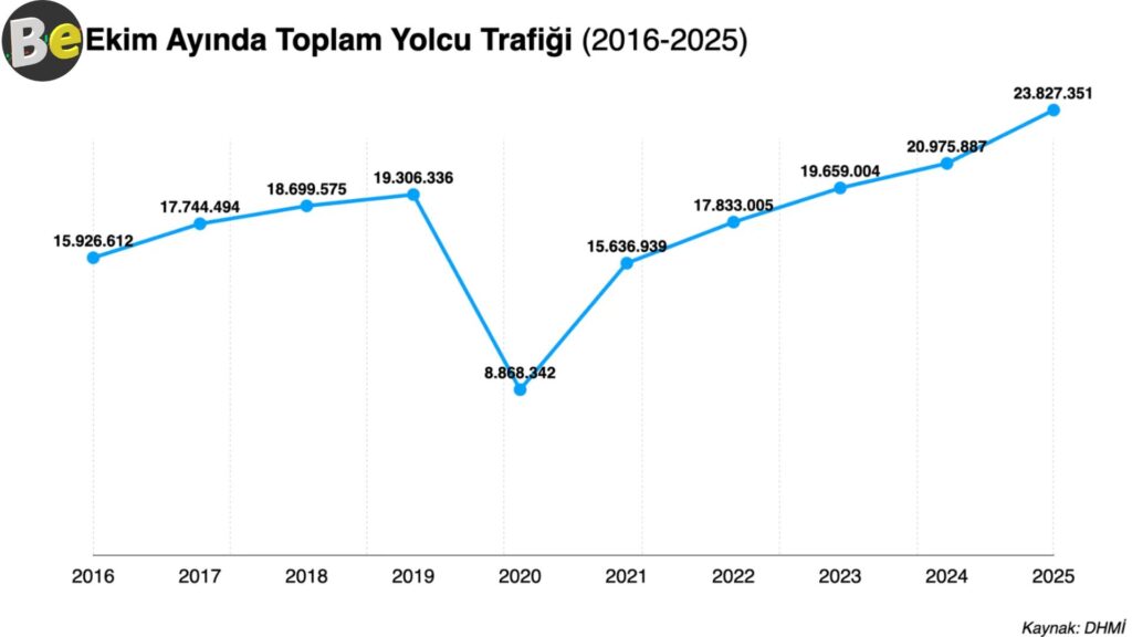 TAV Havalimanları’na ait verilerde ise, ekim ayında toplam hizmet verilen yolcu sayısı 11,5 milyonun üzerine çıktı ve yıllık bazda %11 artış gösterdi. İç hat yolcu sayısı %13, dış hat yolcu sayısı %10 oranında yükseldi. Ocak–ekim döneminde ise toplam yolcu sayısı 98,9 milyona ulaştı ve geçen yılın aynı dönemine göre %6 artış kaydedildi. Ekim ayında işletilen havalimanlarında toplam uçuş sayısı yıllık bazda %11 artarak 75.739’a çıktı; dış hat uçuşları %10, iç hat uçuşları %13 büyüdü.